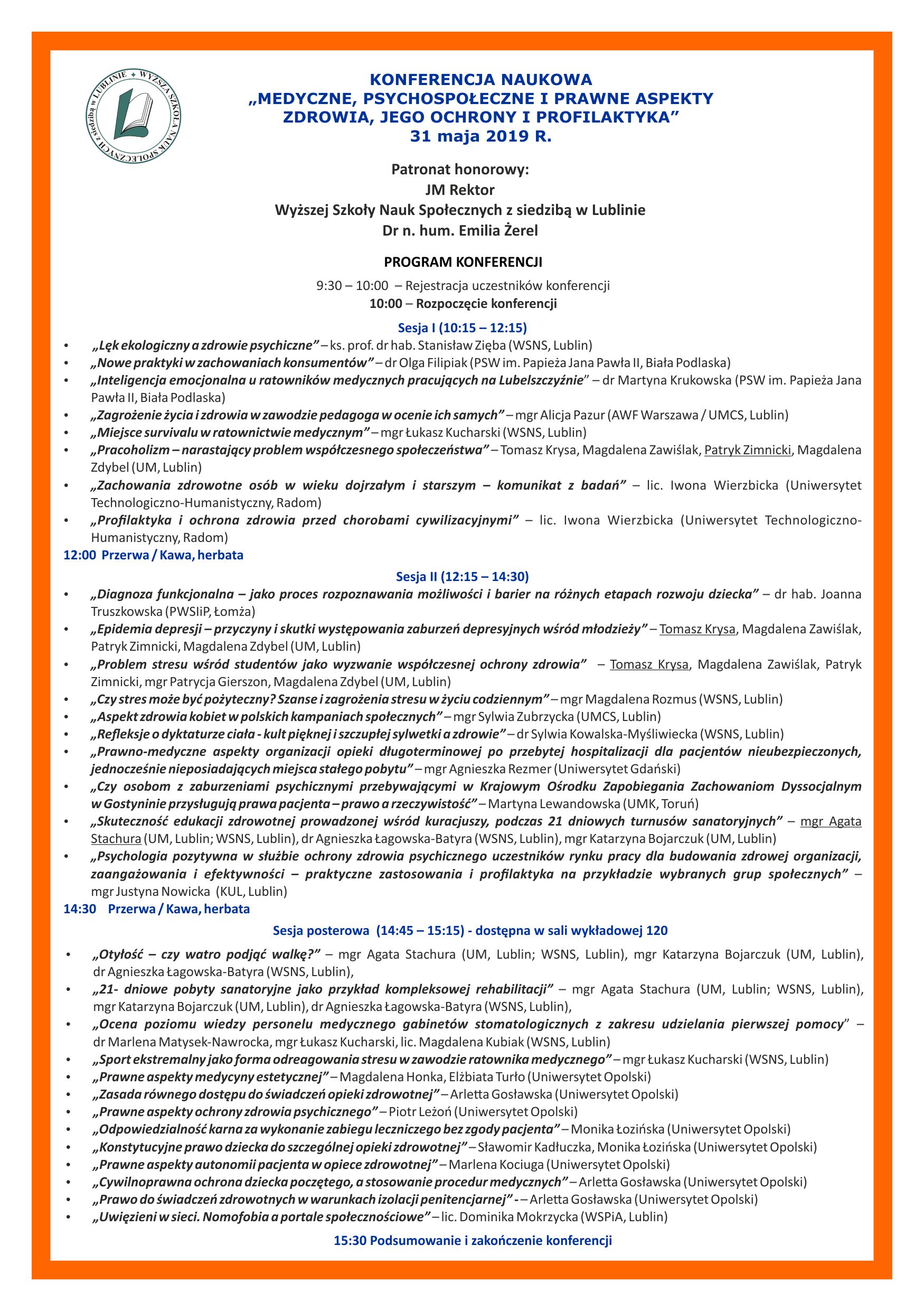 Konferencja Naukowa „Medyczne, psychospołeczne i prawne aspekty zdrowia, jego ochrony i profilaktyka”, Lublin, 31 maja 2019 r.