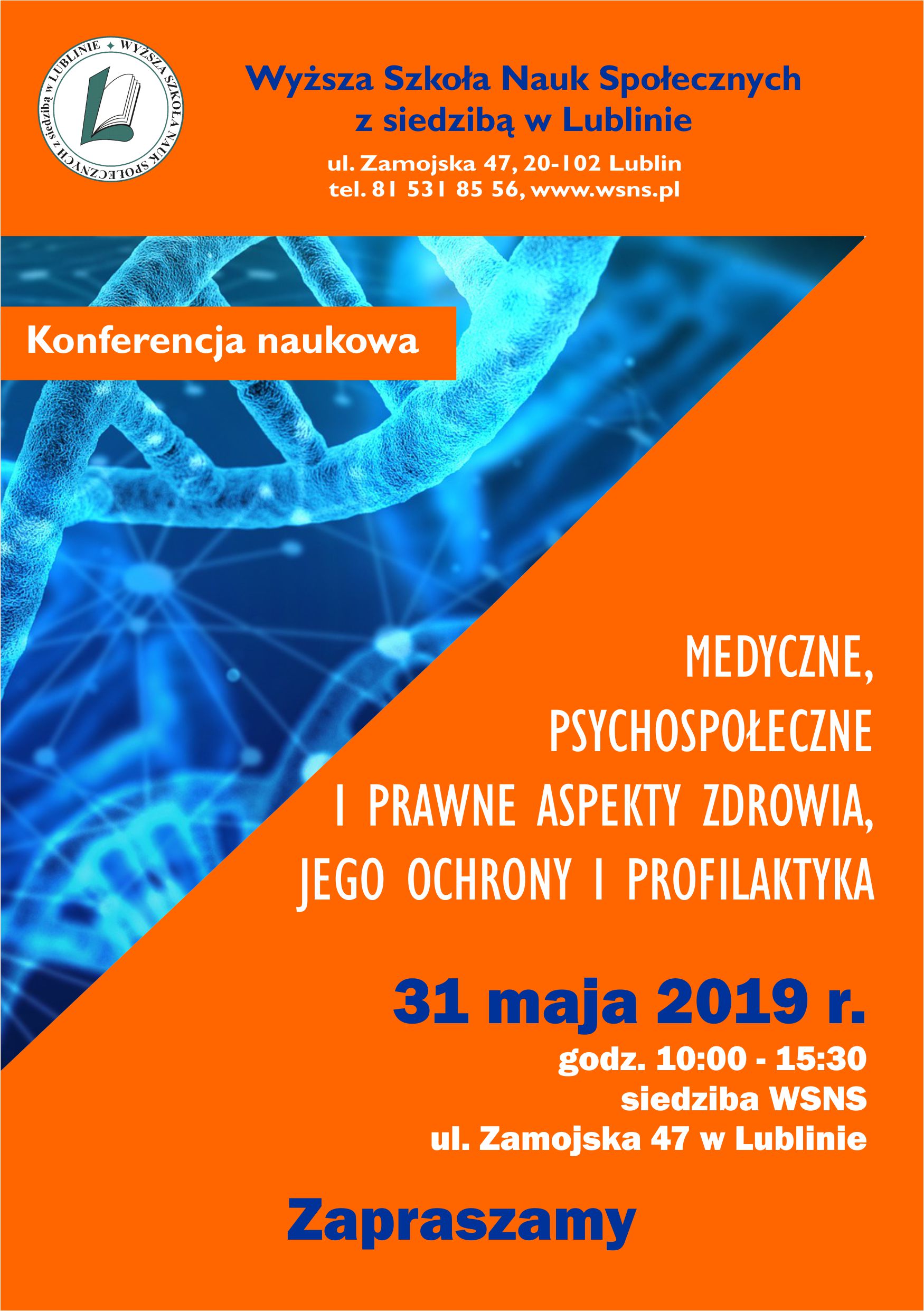 W imieniu Władz Wyższej Szkoły Nauk Społecznych z siedzibą w Lublinie mam przyjemność zaprosić Państwa do udziału w Interdyscyplinarnej Konferencji Naukowej pt. „Medyczne, psychospołeczne i prawne aspekty zdrowia, jego ochrony i profilaktyka”, która odbędzie się w dniu 31 maja 2019 r. w siedzibie Uczelni przy ul. Zamojskiej 47 w Lublinie.
